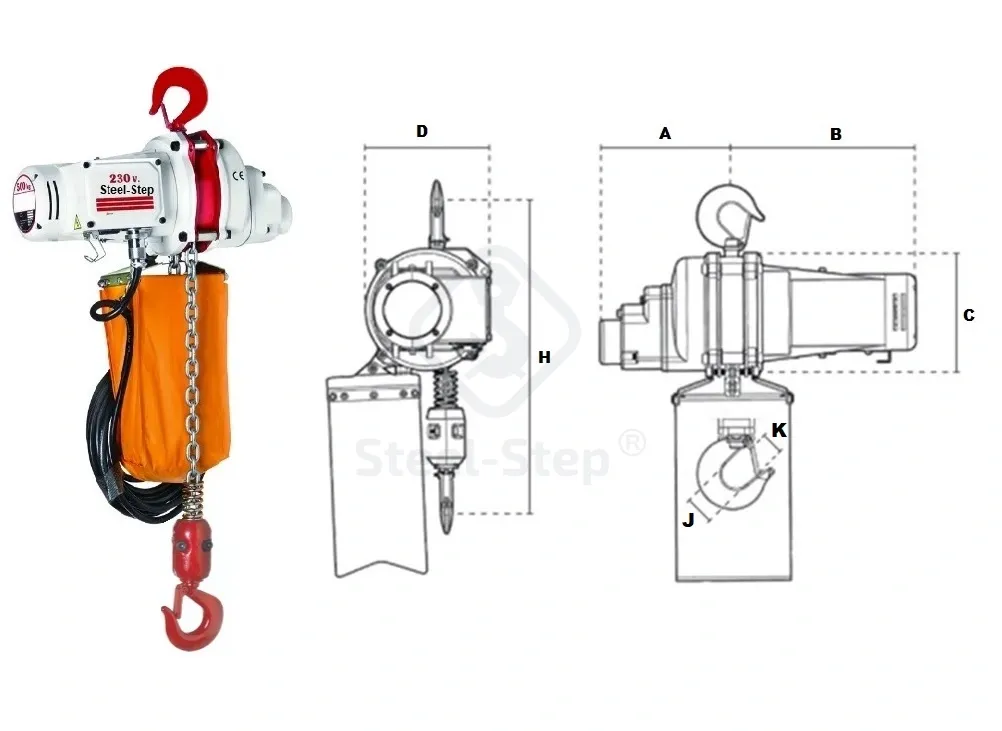 Széleskörű ipari alkalmazásokhoz alkalmas. Emelési magasság: 3 méter, de bármilyen méretre átalakítjuk. Vezérlő kábel: Normál 6 méter, Feszültség: 230V / 50 Hz / 1 Ph (110V kérésre). Emelő lánc: Horganyzott teherlánc az EN 818-7  Tápkábel: 5 méter dugóval,  Ház védelem: IP 54,  Vezérlés védelme: IP 65. Besorolás: M4 / 1Am (ISO / FEM). Üzemi ciklus: 30% / 180,  Szigetelési osztály: F. Üzemi hőmérséklet: -10 ° C - + 40 ° C. Megfelel a 2006/42/EK gépekre vonatkozó irányelvnek. Vizsgálati tanúsítvánnyal, CE megfelelőségi nyilatkozattal és használati utasítással szállítjuk. Biztonsági retesszel ellátott, elforgatható teherhoroggal van szerelve.. Amennyiben a megfelelő termék kiválasztásával, műszaki alkalmasságával kapcsolatban kérdése van, forduljon szakembereinkhez!  Telefon: 06 (52) 316-319