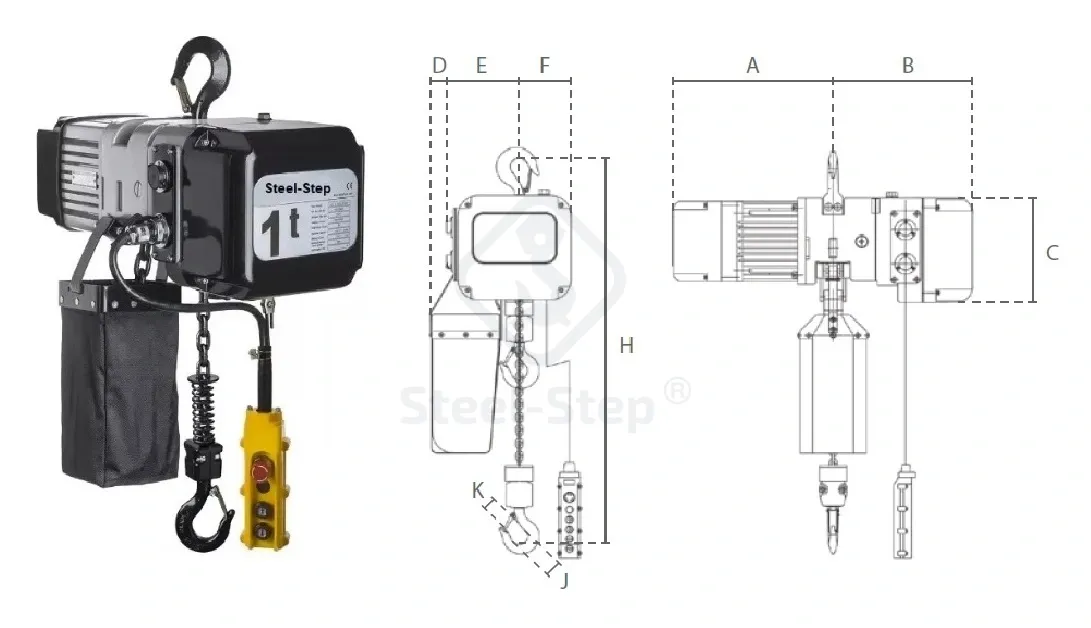 Főbb jellemzők: Munkaterhelés: 500 kg, Vezérlő kábel: Normál 3 méter. Emelési sebesség: 5 m / perc (egy sebesség), Emelési sebesség: 5 / 51.7 m / perc (két sebesség). Emelési magasság: bármilyen méretre átalakítjuk. Energiafogyasztás: 1,1 kW, Nettó súly: 45 kg. Feszültség: 400V / 50-60 Hz / 3 Ph, Tápkábel: 1 méter dugó nélkül. Ház védelem: IP 55, Vezérlés védelme: IP 65. Besorolás: M5 / 2m (ISO / FEM). Üzemi ciklus: 40% / 240, Üzemi hőmérséklet: -20 ° C - + 40 ° C. Szigetelési osztály:F. Biztonság: Túlterhelés elleni védelem: Külsőleg állítható csúszó tengelykapcsoló. Fék: Elektromágneses rugós nyomásfék, szilárdan tartja a terhelést áramkimaradás esetén is. Végállás kapcsoló: Elektromechanikus legmagasabb és legalacsonyabb végállás kapcsoló. Hővédelem: Hőérzékelő védi. Kapcsoló: 24V-os kapcsoló vészleállítóval. Amennyiben a megfelelő termék kiválasztásával, műszaki alkalmasságával kapcsolatban kérdése van, forduljon szakembereinkhez! Telefon: 06 (52) 316-319