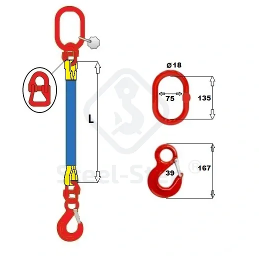 Az FFK egyágú függeszték típusban a végtelenített körkötél helyettesíti a hagyományos sodronykötél-, illetve láncágakat. A kis önsúllyal párosuló nagy teherbírás és a kényes felületű anyagok kíméletes, sérülésmentes kapcsolódása a függesztékcsalád legjellemzőbb előnye. A körkötelek széles felfekvését biztosító speciális kengyelek garantálják a hosszú élettartamot. Meghibásodás vagy más jellegű feladat esetén a függesztékek egyszerű eszközökkel szétszerelhetők és a hibás tag kicserélhető, illetve az új feladathoz illeszkedő függeszték összeszerelhető. Az összteherbírás a maximális 90 fokos szögre vonatkozik.  (Ennél kisebb szög esetén a függeszték teherbírása növekszik). A szerelvényeken a jelölések mm-ben értetendőek. Komponensek: gyűjtőkarika, st-st körkötél összekötővel, EN 1492-2 körkötél, saját védőhuzattal, st-st szemes horog kiakadásgátlóval szerelve. Amennyiben a megfelelő termék kiválasztásával, műszaki alkalmasságával kapcsolatban kérdése van, forduljon szakembereinkhez!  Telefon: 06 (52) 316-319