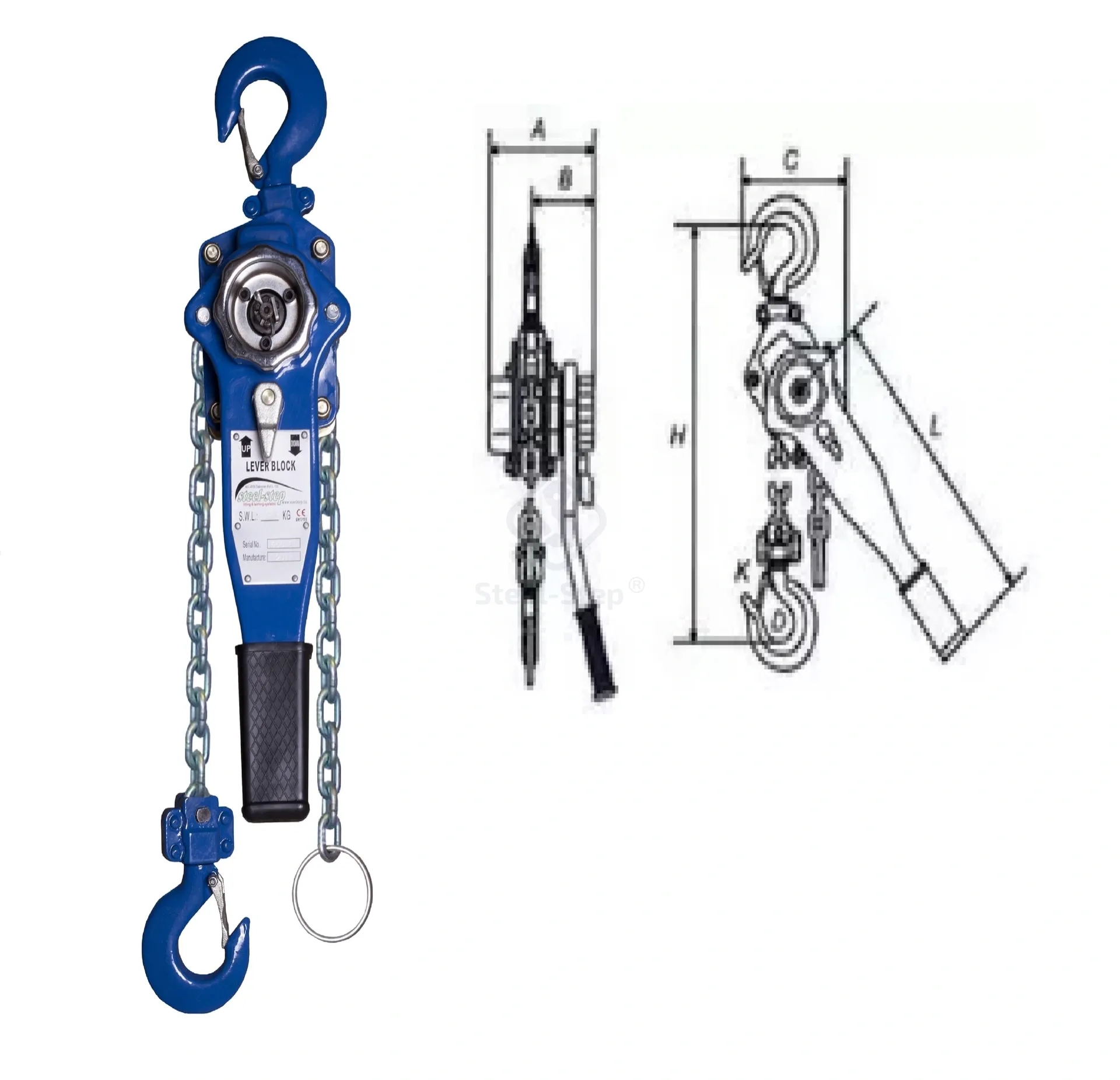 Megfelel a 2006/42/EK gépekről szóló irányelvnek. Vizsgálati tanúsítvánnyal, CE megfelelőségi nyilatkozattal és kezelési utasítással szállítjuk. Felhasználás: rendkívül sokoldalú és hatékony emelőszerkezet, széleskörű alkalmazást tesz lehetővé. Különböző emelő és húzó műveletek elvégzéséhez. A Steel-Step egy kiváló minőségű  karos láncos emelő, tartós és könnyen kezelhető az ergonomikus ütőkar segítségével. A standard emelési magasság 1,5 m. Egyéb emelési magasságok is elérhetőek gyors szállítási idővel raktárról. Minden emelő dinamikus terhelésálló 1,5 x WLL teszten van tesztelve, mielőtt elhagyja a gyárat. A lánckerék tűcsapágyakkal és hajtótengellyel van felszerelve, amelyet tűcsapágy és csúszócsapágy támaszt meg a sima és hatékony működés érdekében. Biztonságos, jól fedett automatikus terhelésreakciós fék 2 fékpofával és 4 fékrugóval felszerelt (kettős biztonság az EN 13157 követelményeihez képest). Az egyedülálló felületkezelés kiváló korrózióvédelmet és alacsony üzemi térfogatot biztosít. A két végén lévő forgó kampók megkönnyítik a sorban történő elhelyezést. A horgokat úgy tervezték, hogy túlterhelés esetén kinyíljanak, ahelyett, hogy eltörnének nagy teherbírású acél biztonsági reteszekkel szerelt horgok. A horog oldalán deformáció-ellenőrző pontok vannak kovácsolva a túlterhelés észlelése érdekében. Amennyiben a megfelelő termék kiválasztásával, műszaki alkalmasságával kapcsolatban kérdése van, forduljon szakembereinkhez!  Telefon: 06 (52) 316-319