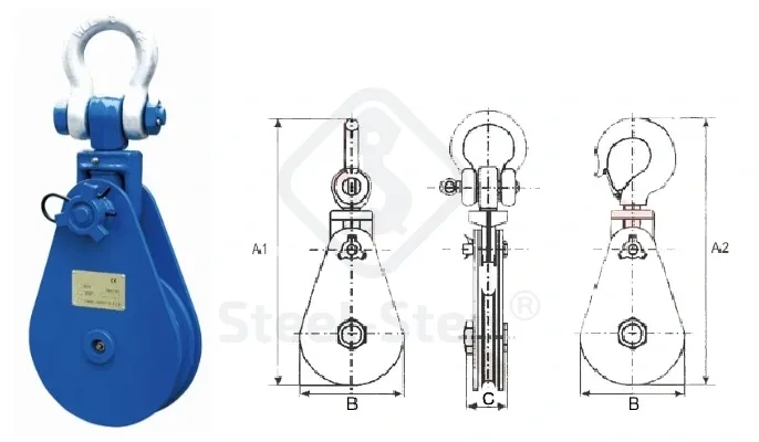 Robusztus, oldalról nyitható emelőcsiga drótkötélhez, horogvégekkel. Felszerelve zsírzógombbal a könnyű karbantartásért. Ideális választás mind emeléshez, mind húzáshoz. Főbb jellemzők: 2–4 t modellek csúszócsapággyal van ellátva, 8 – 30 to modellek kúpgörgős csapággyal van ellátva, Anyag: tartós acélból készül, A gyártási folyamat megfelel a 2006/42/EK Gépek Irányelv követelményeinek. CE-jelöléssel ellátva,  Felületkezelés: kék festéssel, Biztonsági tényező: 4:1. Amennyiben a megfelelő termék kiválasztásával, műszaki alkalmasságával kapcsolatban kérdése van, forduljon szakembereinkhez!  Telefon: 06 (52) 316-319