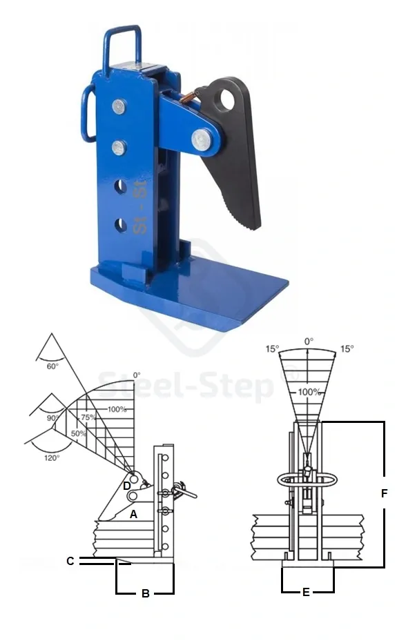 Felhasználási terület: acéltáblák emelésére, mozgatására szolgál csak vízszintes helyzetben! Ha a lemez hossza túl nagy, ajánlott, hogy az emelőrendszer egy gerendát is tartalmazzon. Az állítható vízszintes lemezmegfogó gyártási szabványa: EN 13155. A megfelelő horizontális megfogó kiválasztásakor a megengedett legnagyobb teherbírás mellett a pofanyílásra is figyelni kell – ez határozza meg, hogy a lemezmegfogó milyen minimális és maximális lemezvastagságot tud megfogni és megemelni. Ez a vízszintes  modell csak vízszintes emelésre és kezelésre használható. A lemezmegfogó párjának maximális terhelhetőségét a láncrendszer felső részén kialakuló szög határozza meg, amelynek végein az állítható vízszintes emelőbilincsek találhatók. Ha ez a szög meghaladja a 120°-ot, akkor vörös zónába lépünk, és ilyen körülmények között a bilincsek használata tilos. Ha a láncrendszer felső nyitási szöge legalább 90°, de legfeljebb 120°, akkor a lemezmegfogó maximális teherbírását a névleges teherfelének kell tekinteni – ez a sárga zóna. Ezenkívül minden lemezmegfogó merőlegesen kell állnia a lemez vízszintes síkjára; a maximális oldalirányú eltérés legfeljebb 15° lehet. A Steel-Step Kft ® lemezmegfogó sorozatszámmal és a szabványnak megfelelő azonosító táblával vannak ellátva. A maximális teherbírás (WLL) túllépése szigorúan tilos! Amennyiben a megfelelő termék kiválasztásával, műszaki alkalmasságával kapcsolatban kérdése van, forduljon szakembereinkhez!  Telefon: 06 (52) 316-319