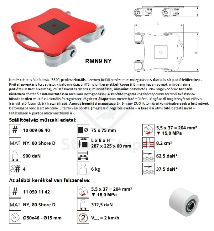 Az ECO-Skate® ROTO MINI a miniatürizálás mestere, mindössze 60 mm-es beépítési magasságával. A nejlon görgők nagy teherbírást tesznek lehetővé a lehető legkisebb helyen és a lehető legalacsonyabb magasság mellett. A forgó alváz olyan kompakt, hogy bármilyen szerszámosládában elfér. Nehéz teher szállító alváz (360°) professzionális, üzemen belüli nehézteher-mozgatáshoz, tiszta és sík padlófelületeken. Kivitel egyenként forgatható, kiváló minőségű HTS 3-komponensű poliuretán kerekekkel (kopásálló, nem nyomot hagyó és vágásálló), csúszásmentes rácsos gumiborítással, A kerékfelfogatás rögzítőcsapokkal történő fixálásának köszönhetően multifunkcionális és rugalmas: rögzített állapotban merev futóműként, kiegészítő forgótányérral ellátva irányítható futóműként használható. Azonos beépítési magasságú L-, S- vagy DUO futóművel kombinálva ezek az alvázak biztonságos rendszert alkotnak 3 felfekvési ponttal (megfelelő rögzítés esetén – a kezelési útmutató betartásával – feltételesen 4 pontos alátámasztással is). Amennyiben a megfelelő termék kiválasztásával, műszaki alkalmasságával kapcsolatban kérdése van, forduljon szakembereinkhez! Telefon: 06 (52) 316-319