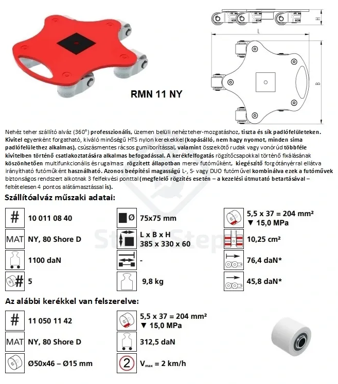 Az ECO-Skate® ROTO MINI a miniatürizálás mestere, mindössze 60 mm-es beépítési magasságával. A nejlon görgők nagy teherbírást tesznek lehetővé a lehető legkisebb helyen és a lehető legalacsonyabb magasság mellett. A forgó alváz olyan kompakt, hogy bármilyen szerszámosládában elfér. Nehéz teher szállító alváz (360°) professzionális, üzemen belüli nehézteher-mozgatáshoz, tiszta és sík padlófelületeken. Kivitel egyenként forgatható, kiváló minőségű HTS 3-komponensű poliuretán kerekekkel (kopásálló, nem nyomot hagyó és vágásálló), csúszásmentes rácsos gumiborítással, A kerékfelfogatás rögzítőcsapokkal történő fixálásának köszönhetően multifunkcionális és rugalmas:  rögzített állapotban merev futóműként, kiegészítő forgótányérral ellátva irányítható futóműként használható. Azonos beépítési magasságú L-, S- vagy DUO futóművel kombinálva ezek az alvázak biztonságos rendszert alkotnak 3 felfekvési ponttal (megfelelő rögzítés esetén – a kezelési útmutató betartásával – feltételesen 4 pontos alátámasztással is). Amennyiben a megfelelő termék kiválasztásával, műszaki alkalmasságával kapcsolatban kérdése van, forduljon szakembereinkhez!  Telefon: 06 (52) 316-319
