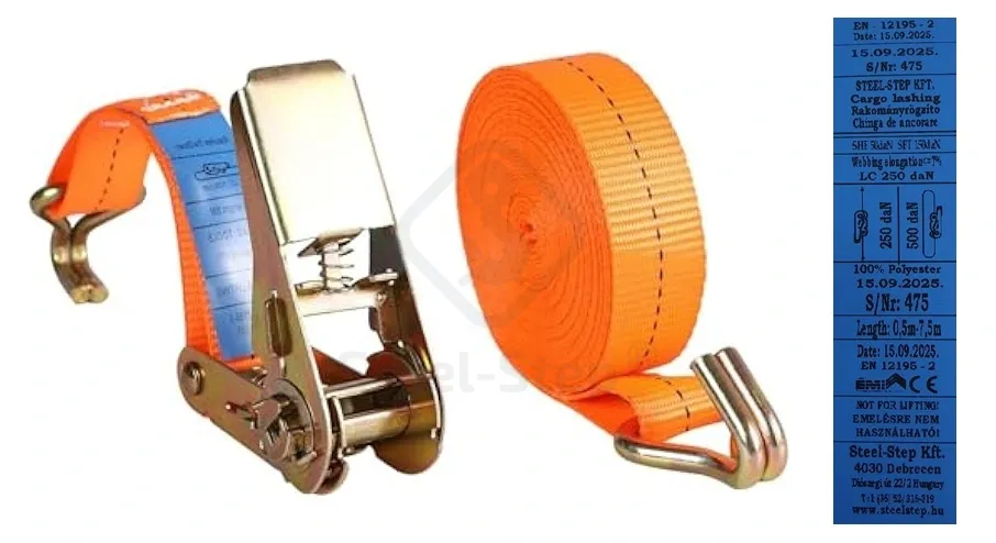Igény szerint bármely hosszban, saját műhelyünkben gyártjuk rakományrögzítőinket. Az ajánlott típusok kétféle kivitelben kerülnek kiszerelésre: Hegyeshorgos kivitel (hh): egy darab rövid ágból (0,5 m egyik végén feszítőszerkezet, másik végén horog), illetve egy darab ún. hosszú ágból (3-20m egyik végén horoggal) áll. Vagy horog nélküli kivitel (hn): egyik végén feszítő szerkezettel vagy csattal (hosszúság: 3-20 m). 25 mm széles narancs vagy fekete hevederanyagból készül. Gyártva: EN 12195-2 szabvány szerint, TÜV és CE jelöléssel. Fokozottan ügyeljen a heveder nyúlási paraméterére, amely szabvány szerint max. 7%. Segítünk a fuvarozóknak kiválasztani a megfelelő anyagokat a rakomány rögzítéséhez, valamint készséggel adunk tanácsot a rögzítéssel és a szállítás biztonságával kapcsolatban. Alkalmazási terület: Közúti, vasúti, vízi és légi szállításnál valamint az üzemi anyagmozgatásnál a rakományok gyors és biztonságos rögzítésére. Javaslat: sarokvédő használatával a rögzítési biztonság fokozható, az élettartam meghosszabbítható. Amennyiben a megfelelő termék kiválasztásával, műszaki alkalmasságával kapcsolatban kérdése van, forduljon szakembereinkhez! Telefon: 06 (52) 316-319