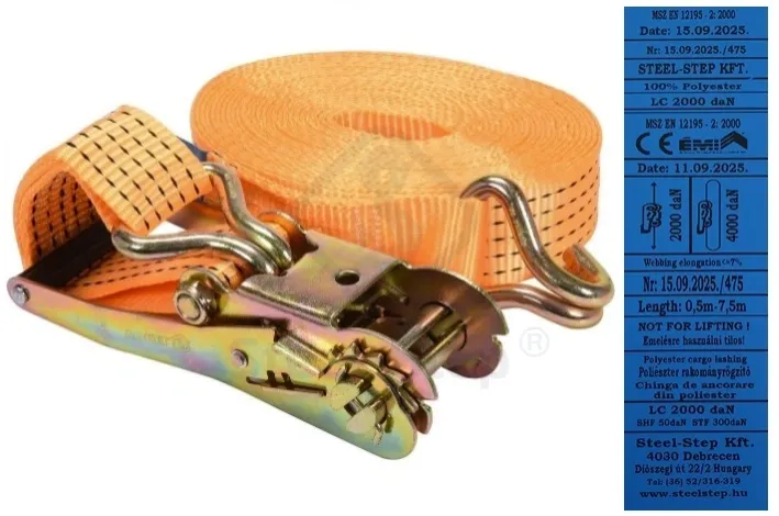 Igény szerint bármely hosszban, saját műhelyünkben gyártjuk rakományrögzítőinket. Az ajánlott típusok kétféle kivitelben kerülnek kiszerelésre: Hegyeshorgos kivitel (hh): egy darab rövid ágból (0,5 m egyik végén feszítőszerkezet, másik végén horog), illetve egy darab ún. hosszú ágból (3-20m egyik végén horoggal) áll. Vagy horog nélküli kivitel (hn): egyik  végén feszítő szerkezettel (hosszúság: 3-20 m). Szélesség: 50 mm és 75 mm hevederanyag, a heveder színek: narancs, piros, fekete, sárga. Gyártva: EN 12195-2 szabvány szerint, TÜV és CE jelöléssel. Fokozottan ügyeljen a heveder nyúlási paraméterére, amely szabvány szerint max. 7%. Segítünk a fuvarozóknak kiválasztani a megfelelő anyagokat a rakomány rögzítéséhez, valamint készséggel adunk tanácsot a rögzítéssel és a szállítás biztonságával kapcsolatban. Alkalmazási terület: Közúti, vasúti, vízi és légi szállításnál valamint az üzemi anyagmozgatásnál a rakományok gyors és biztonságos rögzítésére. Javaslat: sarokvédő használatával a rögzítési biztonság fokozható, az élettartam meghosszabbítható. Amennyiben a megfelelő termék kiválasztásával, műszaki alkalmasságával kapcsolatban kérdése van, forduljon szakembereinkhez! Telefon: 06 (52) 316-319