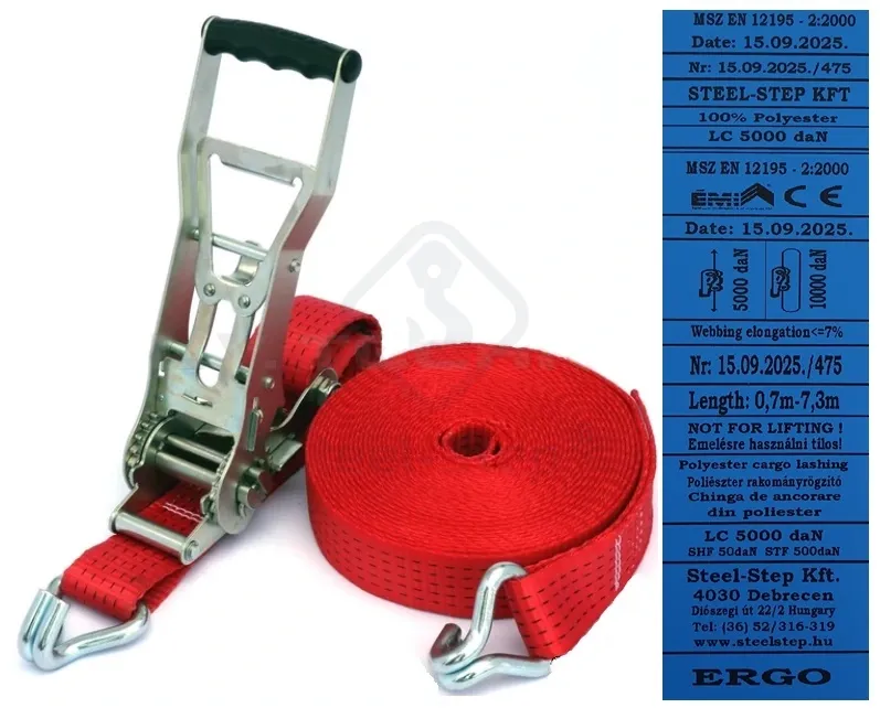 ERGO feszítő szerkezettel (hosszúság: 3-20 m). Szélesség: 50 mm és 75 mm hevederanyag, a heveder színek: narancs, piros, fekete, sárga. Gyártva: EN 12195-2 szabvány szerint, TÜV és CE jelöléssel. Fokozottan ügyeljen a heveder nyúlási paraméterére, amely szabvány szerint max. 7%. Segítünk a fuvarozóknak kiválasztani a megfelelő anyagokat a rakomány rögzítéséhez, valamint készséggel adunk tanácsot a rögzítéssel és a szállítás biztonságával kapcsolatban.