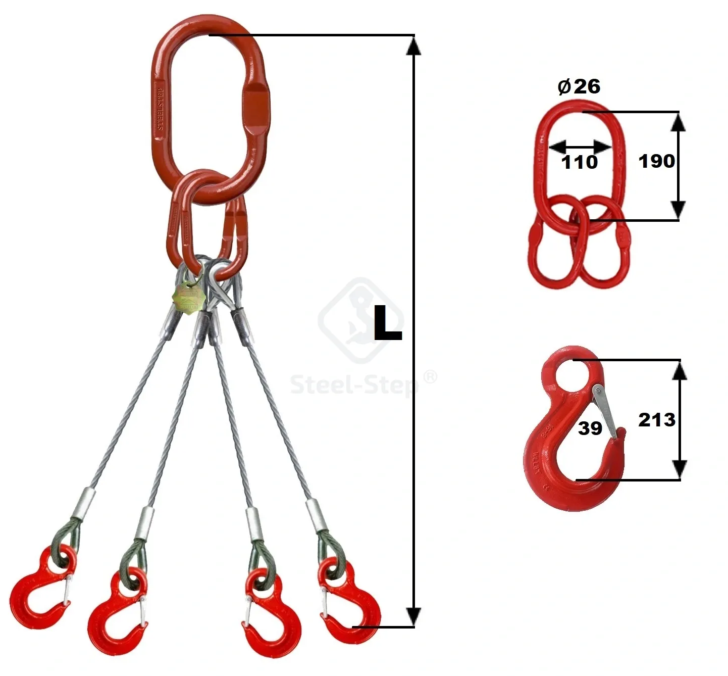 Dispozitiv de ridicare din cablu cu 4 ramuri (H-tip) - Four leg wire rope sling, H-type